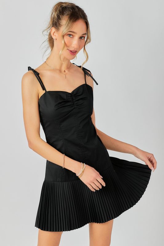 Sweetheart Neckline Pleats Mini Dress Spaghetti shoulder strap Back hidden zipper Ruched style Model Measurements Height 5’8″ Bust 32″ Waist