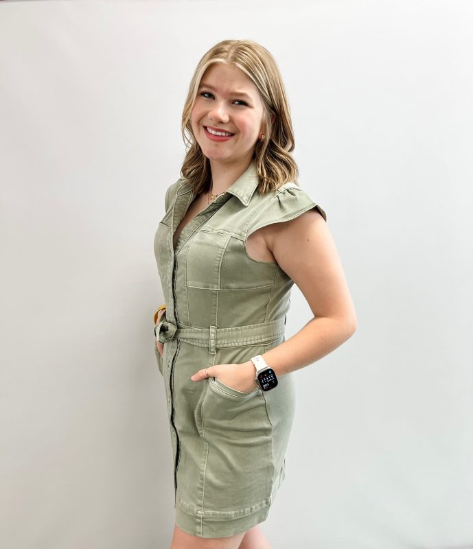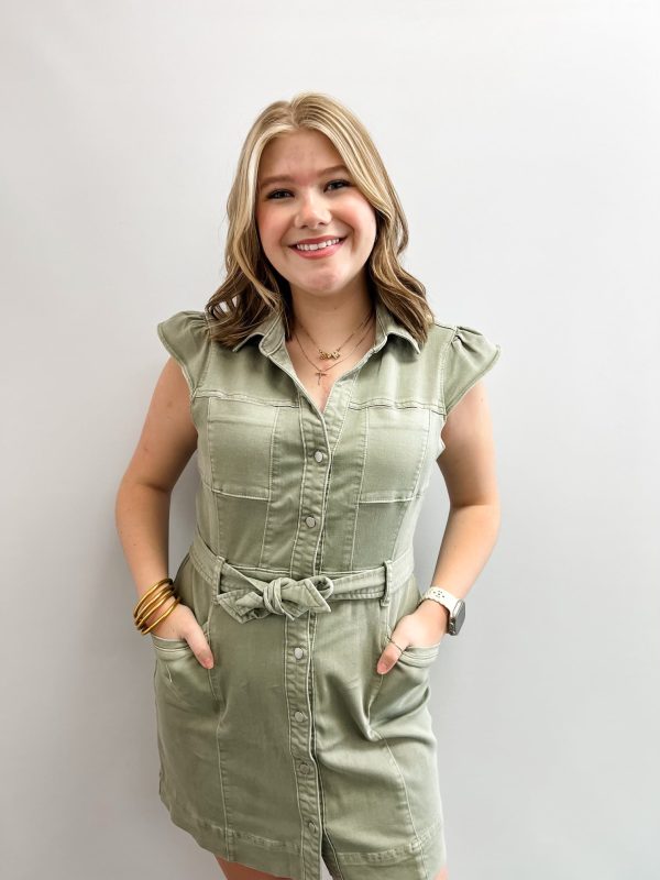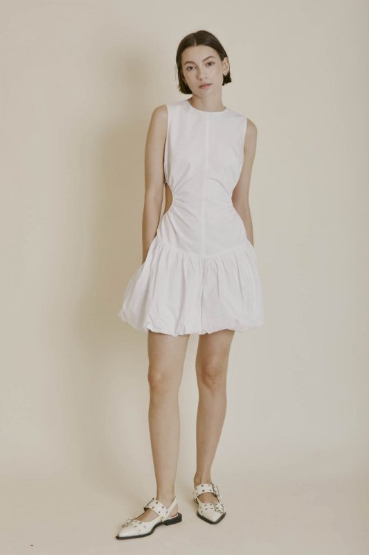 Pleated Utility Mini Dress Shirred sleeves Pleated waistline Exposed zipper closure Fabric: Non stretch cotton twill Model is 5’9″ and