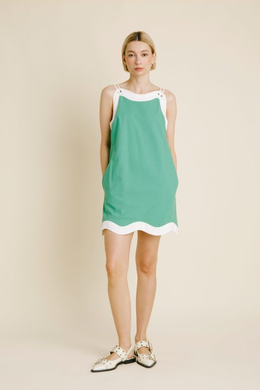 Wave Hem Mini Dress Wave hem detail Side invisible zipper Fully lined Fabric: Non-stretch linen Model is 5’9″ and is