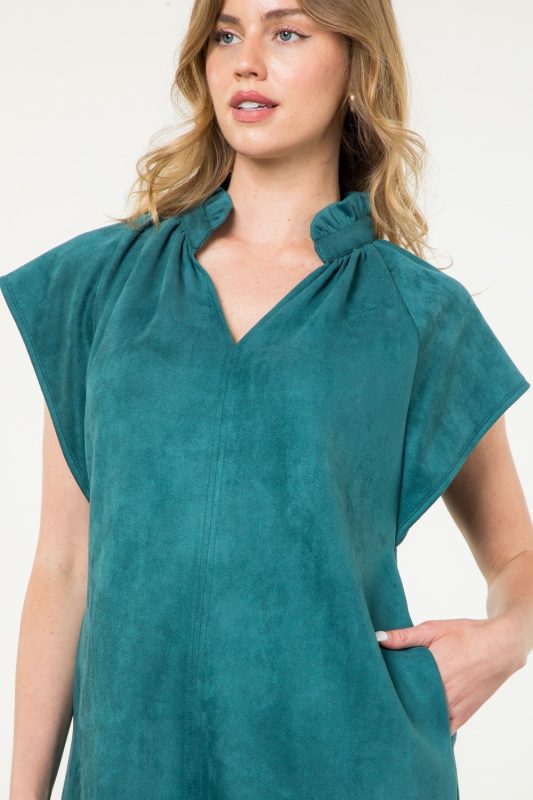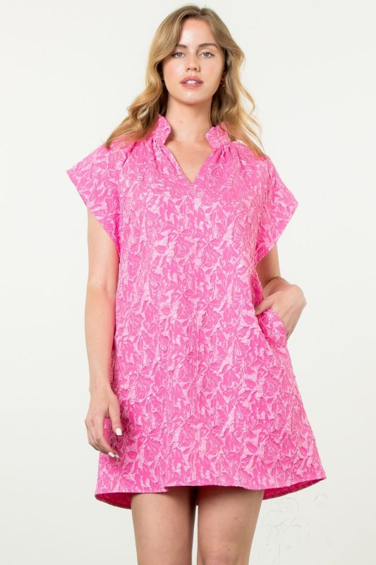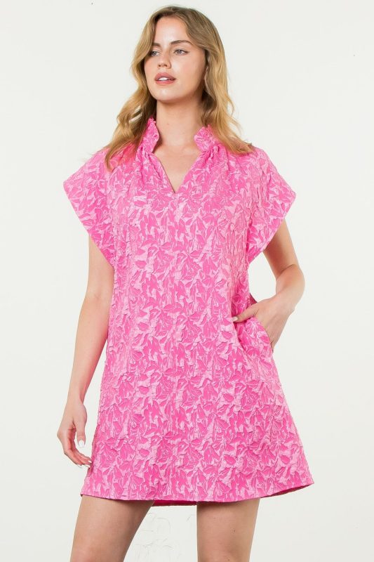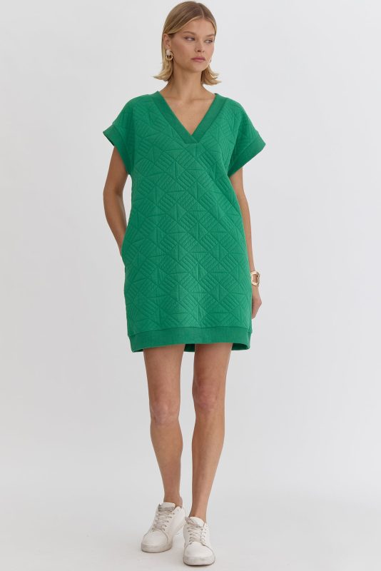 Textured solid v-neck short sleeve mini dress featuring pocket at sides. Unlined. Knit. Non-sheer. Lightweight. Fabric Contents: 55%POLYESTER 43%COTTON 2%SPANDEX