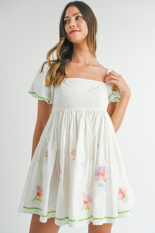 Poplin with embroidered floral detail perfect babydoll mini dress with puff sleeve and smocked back detailing. Lining. Side invisible zipper.