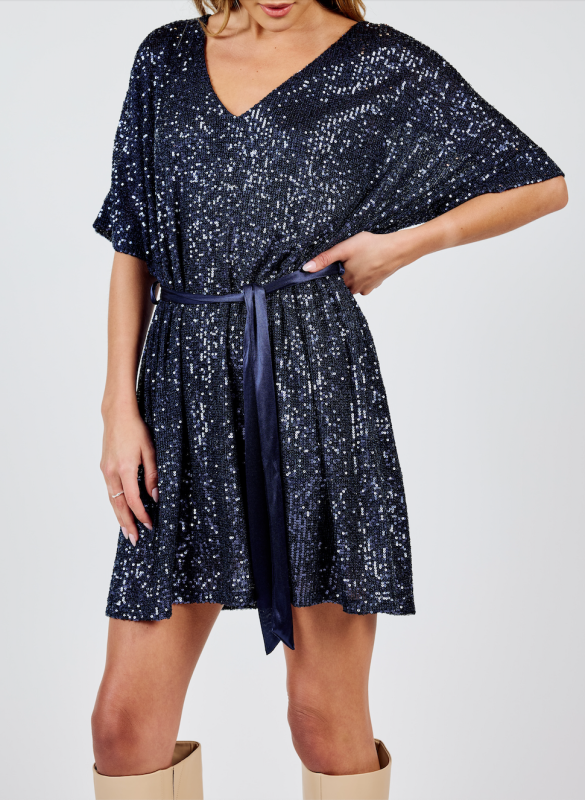 Sky High V-Neck Sequin Dress with Tie Belt Fabric Contents: SHELL: 95%POLYESTER 5%SPANDEX, LINING: 100%