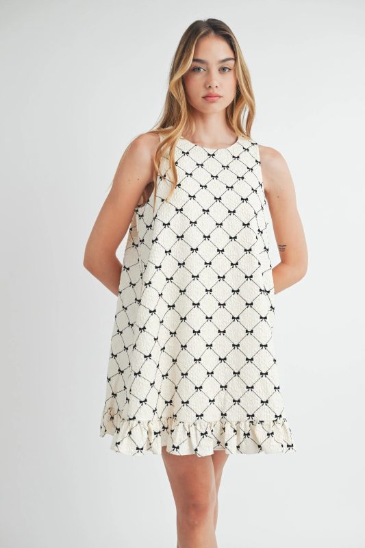 Bow Flocking Textured Ruffle Hem Mini Dress Features: Round neckline Sleeveless Mini length Babydoll silhouette Ruffle hem Pearl buttons down