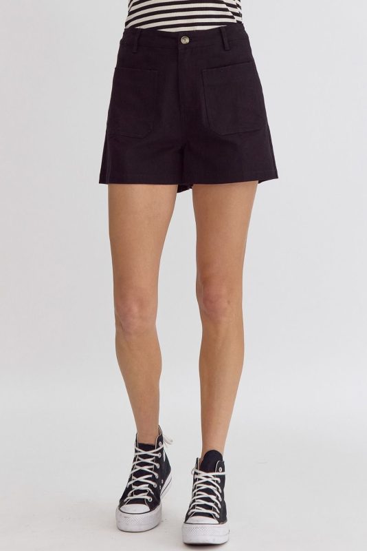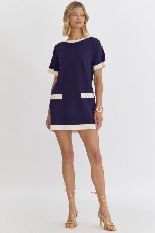 Solid round neck short sleeve mini dress featuring faux buttons at shoulders and front. Unlined. Knit. Non-sheer. Lightweight. Fabric Contents: 65%VISCOSE