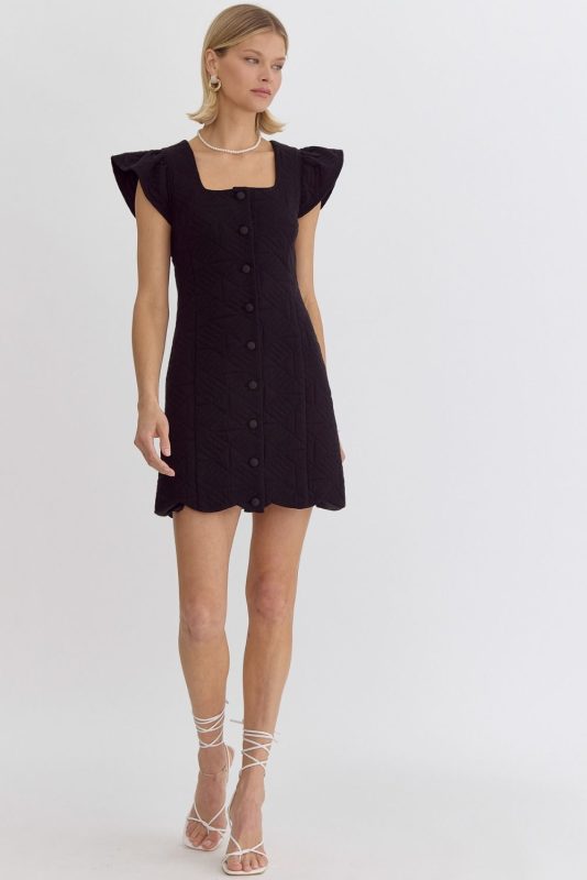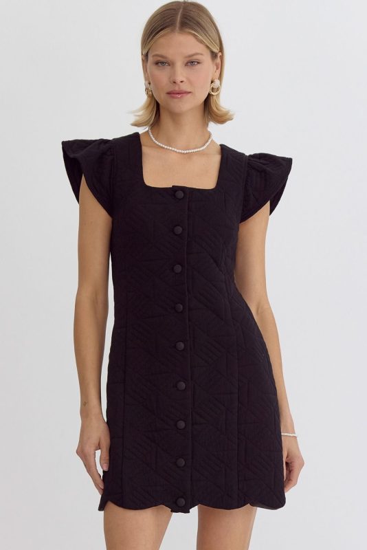 Quilted square neck ruffle sleeve button down mini dress featuring scallop trim at hem. Unlined. Knit. Non-sheer. Lightweight. Fabric Content: