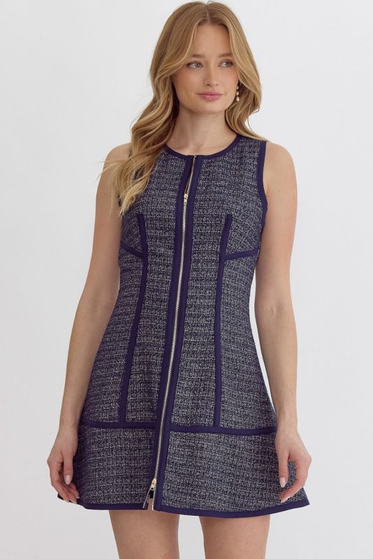 Tweed round neck sleeveless mini dress featuring contrast stitching. Dual zipper. Lined. Woven. Non-sheer. Lightweight. Fabric Contents: 73%POLYESTER 27%RAYON Model is