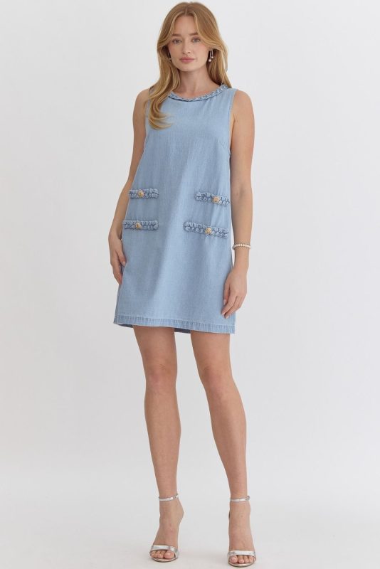 Denim round neck sleeveless mini dress featuring braid detailing. Zipper closure at back. Lined. Woven. Non-sheer. Lightweight. Fabric Contents: 100%COTTON Model