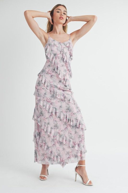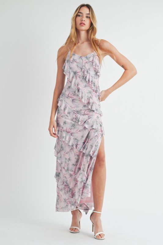 Floral print mesh adjustable spaghetti strap deep v-neck line ruffle tiered maxi dress with side slit. Lining Fabric Contents: 90%