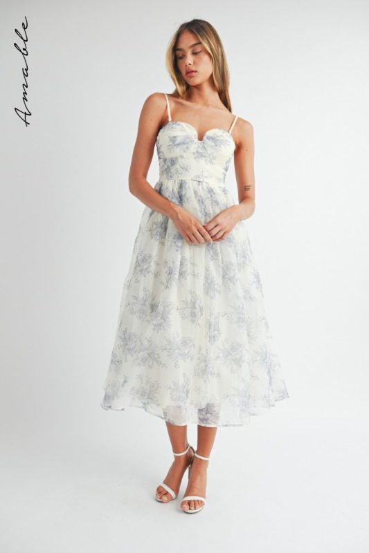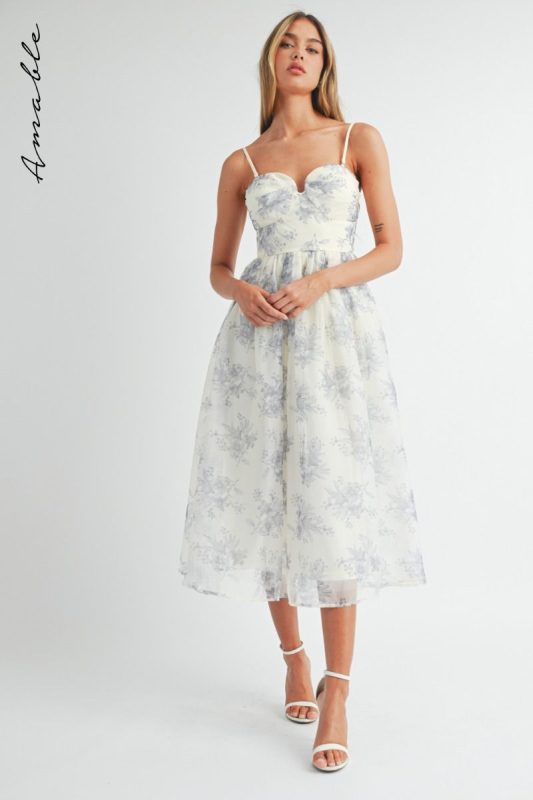 Floral print organza strapless plunged neckline babydoll midi dress. Lining. Back smocked. Invisible zipper. Fabric Contents: 80% POLYESTER 20% NYLON