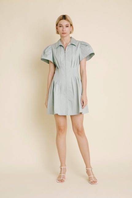 Pleated Utility Mini Dress Shirred sleeves Pleated waistline Exposed zipper closure Fabric: Non stretch cotton twill Model is 5’9″ and