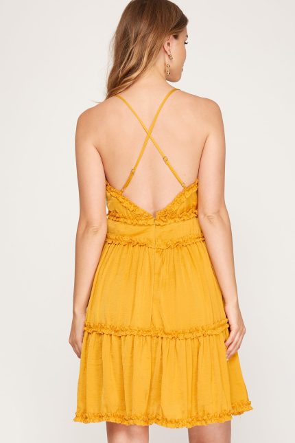 Woven Satin Tiered Cami Dress with Lining and Ruffle Detail MODEL IS 5’8″ Wearing a Size Small Fabric Contents: S:100%POLYESTER