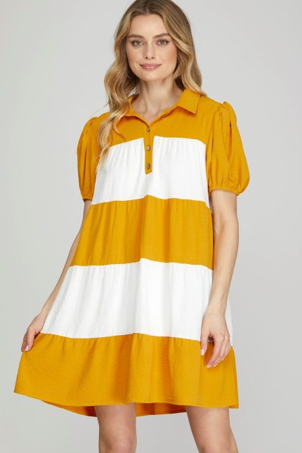 Game Day – Short Puff Sleeve Woven Color Block Tiered Dress Fabric Contents: S:100%Polyester C:100%Polyester L:100%Polyester Model: Is 5’8″ And