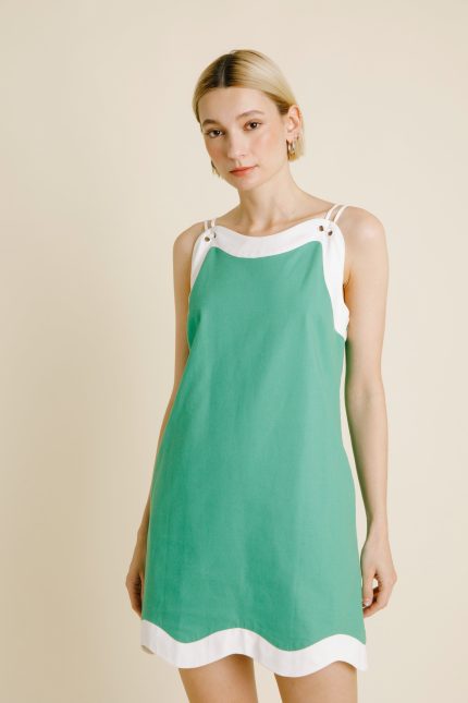 Wave Hem Mini Dress Wave hem detail Side invisible zipper Fully lined Fabric: Non-stretch linen Model is 5’9″ and is