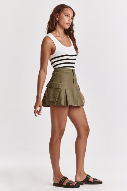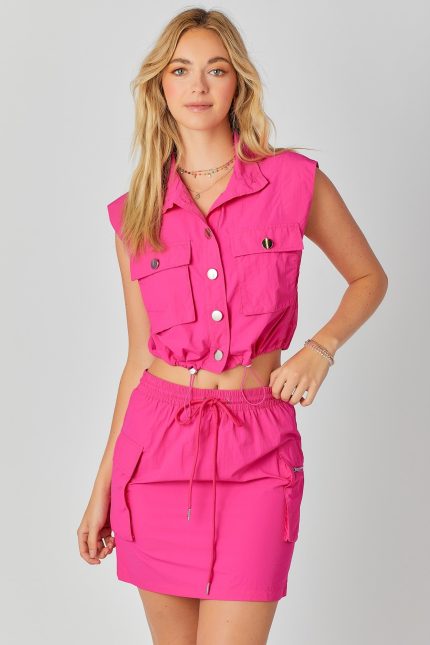 Sporty Top and Skirt SetTop-Sleeveless Top.-Button Closure at Front.-Functional Front Pockets.-Gathering with adjustable drawstring at the bottom of the top.Skirt-Elasticized