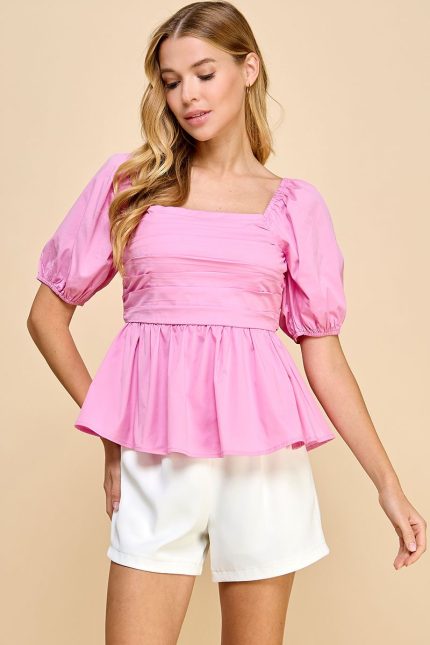 Square neckline, puff sleeve top with pleated detailing. Featuring an adjustable back tie, a concealed back zipper and a ruffle