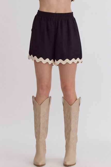 High-waisted shorts featuring ric rac trim. Elastic at waist. Pocket at sides. Lined. Woven. Non-sheer. Lightweight. Fabric Contents: 100%POLYESTER Model is