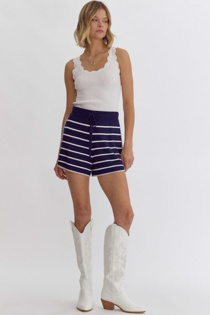 Striped high-waisted knit shorts featuring drawstring at waistband. Unlined. Knit. Non-sheer. Lightweight. Fabric Content: 90%VISCOSE 10%SPANDEX Model: 5’10” and wearing