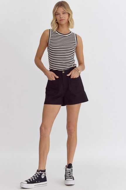 Solid high waisted shorts featuring pockets at front and back. Zipper and button closure. Belt loops. Unlined. Woven. Non-sheer. Lightweight.