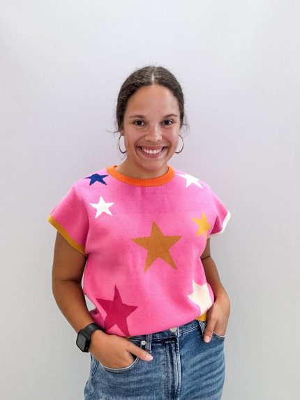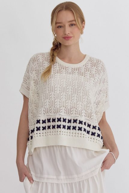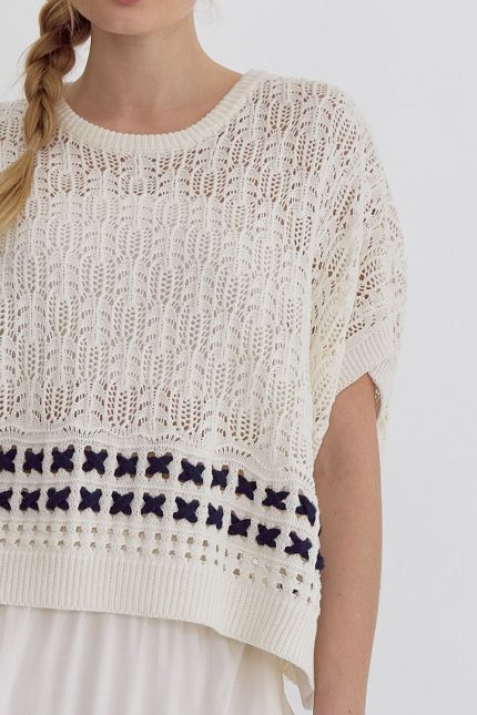 Solid round neck short sleeve top featuring contrasting stitching. Unlined. Knit. Semi-sheer. Lightweight. Fabric Contents: 100%COTTON Model: 5’10” and wearing