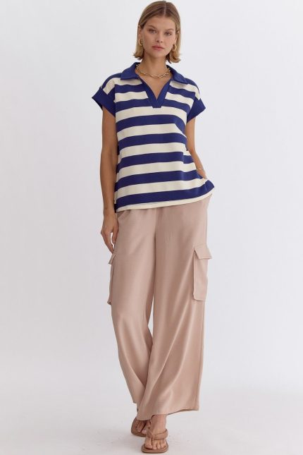 Stripe collared cap sleeve v-neck top featuring slit at sides. Unlined. Knit. Non-sheer. Lightweight. Fabric Contents: 58%POLY 30%COTTON 10%RAYON 2%SPAN