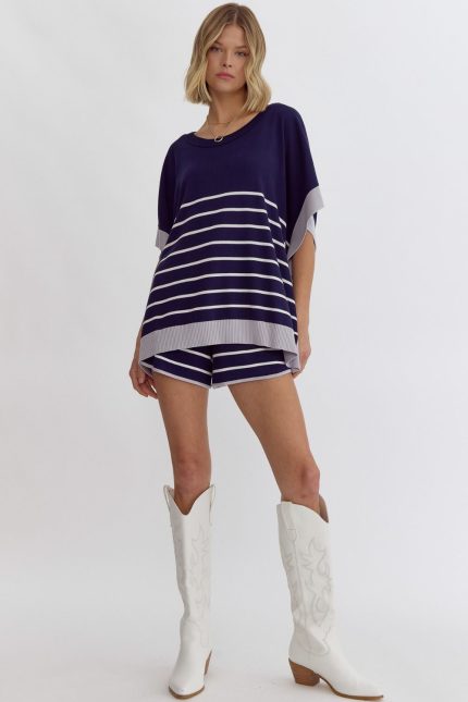 Solid round neck poncho style top featuring stripe details. Unlined. Knit. Non-sheer. Lightweight. Fabric Contents: 90%VISCOSE 10%SPANDEX Model: 5’10” and