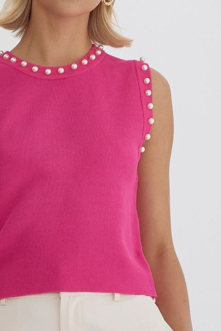Solid round neck sleeveless cropped top featuring pearl detail. Unlined. Knit. Non-sheer. Lightweight. Fabric Contents: 63%POLYESTER 37%NYLON Model is 5’10” and wearing