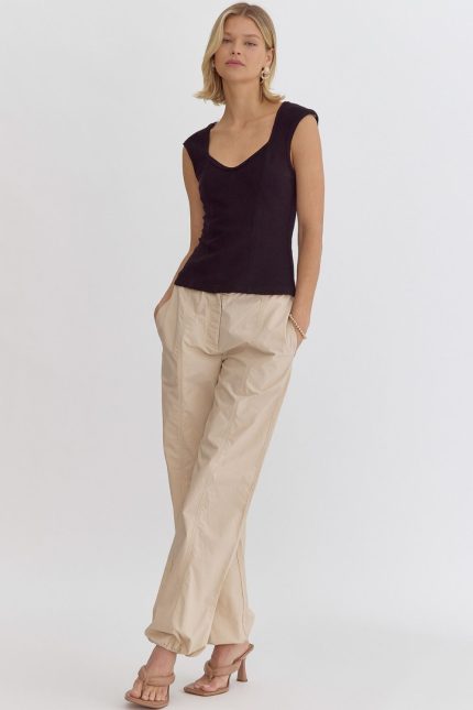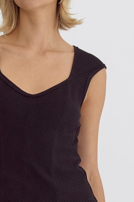 Solid sweetheart neck sleeveless top. Unlined. Knit. Non-sheer. Lightweight. Fabric Contents: 61%POLYESTER 33%COTTON 6%SPANDEX Model is 5’10” and wearing size Small.