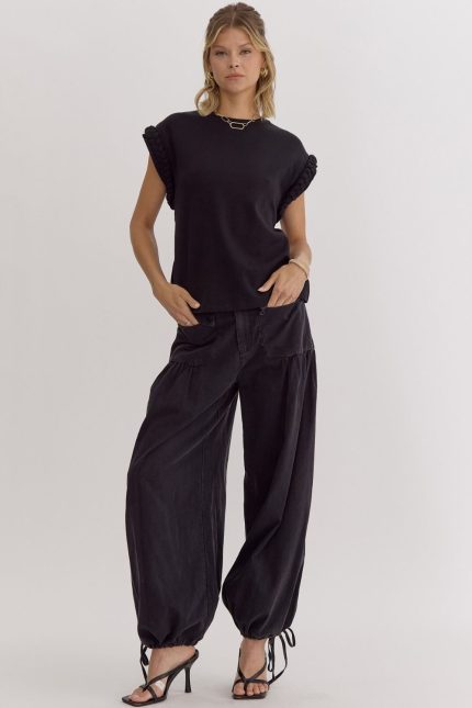 Solid round neck cap sleeve top featuring braided detail at cuff. Unlined. Knit. Non-sheer. Lightweight. Fabric Contents: 84%COTTON 16%POLYESTER Model is5’10”