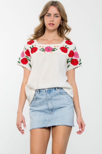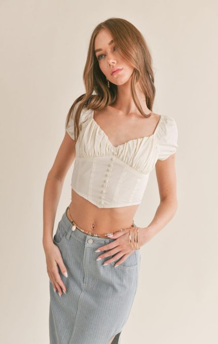 Rolled short sleeve, v-neck top with overlap neck band finished drop shoulder in gauze softness. Solid color woven on relaxed