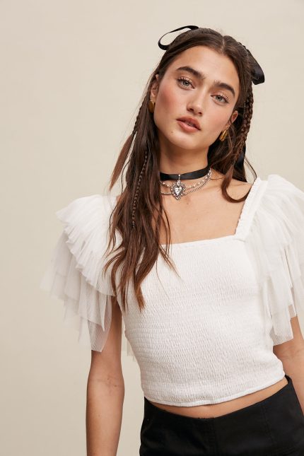 Smocked Square Neck Tiered Ruffle Sleeve Top Square neckline with elastic Mesh layered ruffle sleeves Smocking on body Waist length