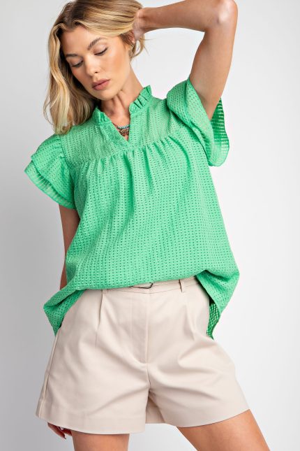 Textured Poly Creep Woven Top V-Neckline with Ruffle Detailing Ruching Detailing Double Wing Short Sleeves Square Gridded Eyelet Textured Fabrication