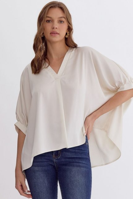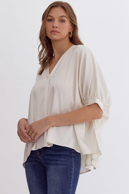 Satin v-neck 1/2 sleeve top featuring front placket detail. Unlined. Woven. Non-sheer. Lightweight. Fabric Content: 100%POLYESTER Model: 5’10” and wearing