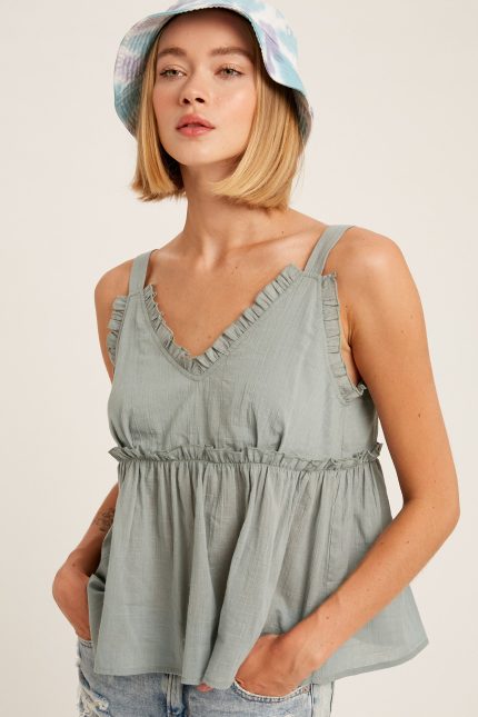 Textured Cotton V-Neck Ruffle Camisole Top – Textured cotton V-neck ruffle camisole top– Textured cotton woven fabric– V-neck– Sleeveless– Ruffles