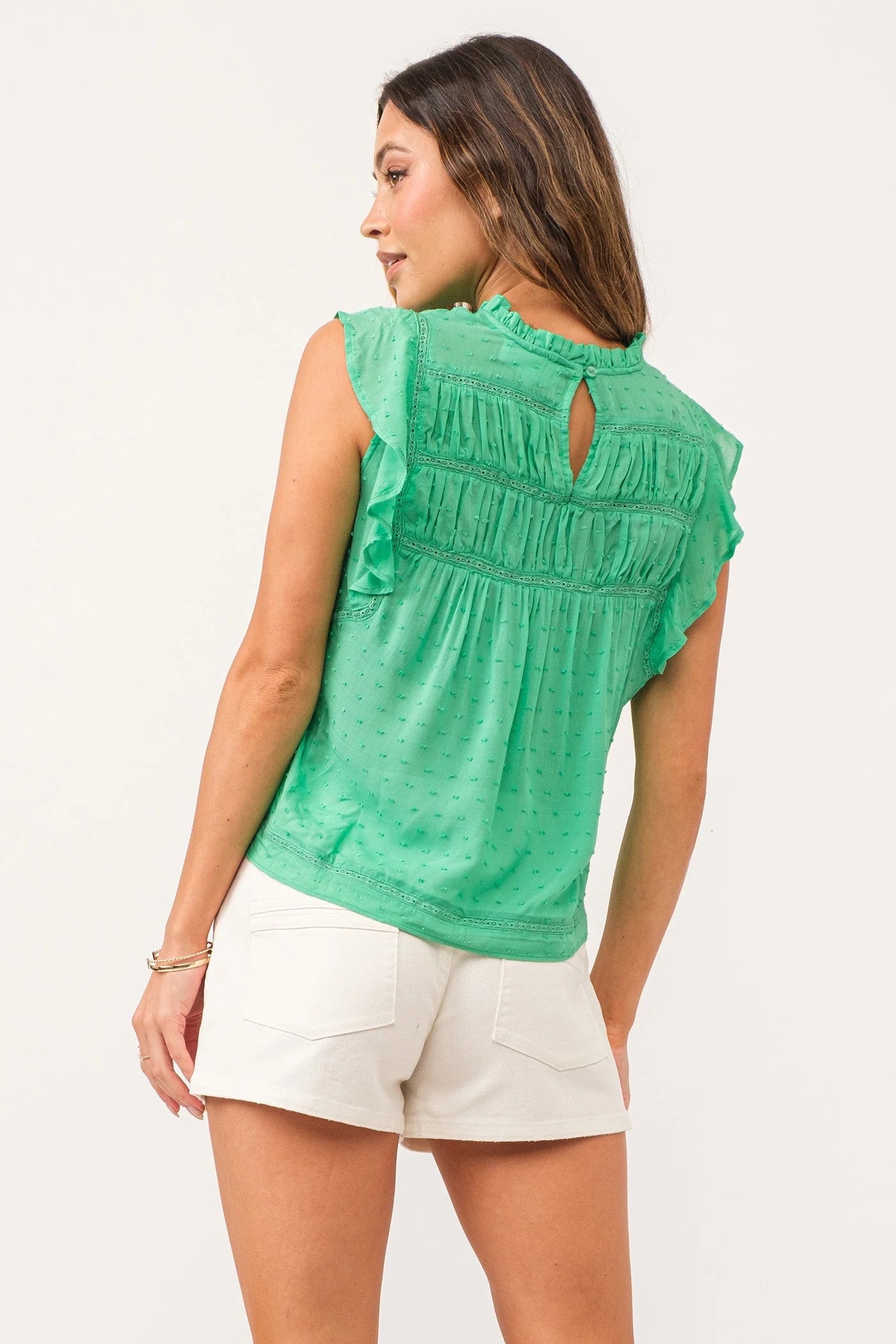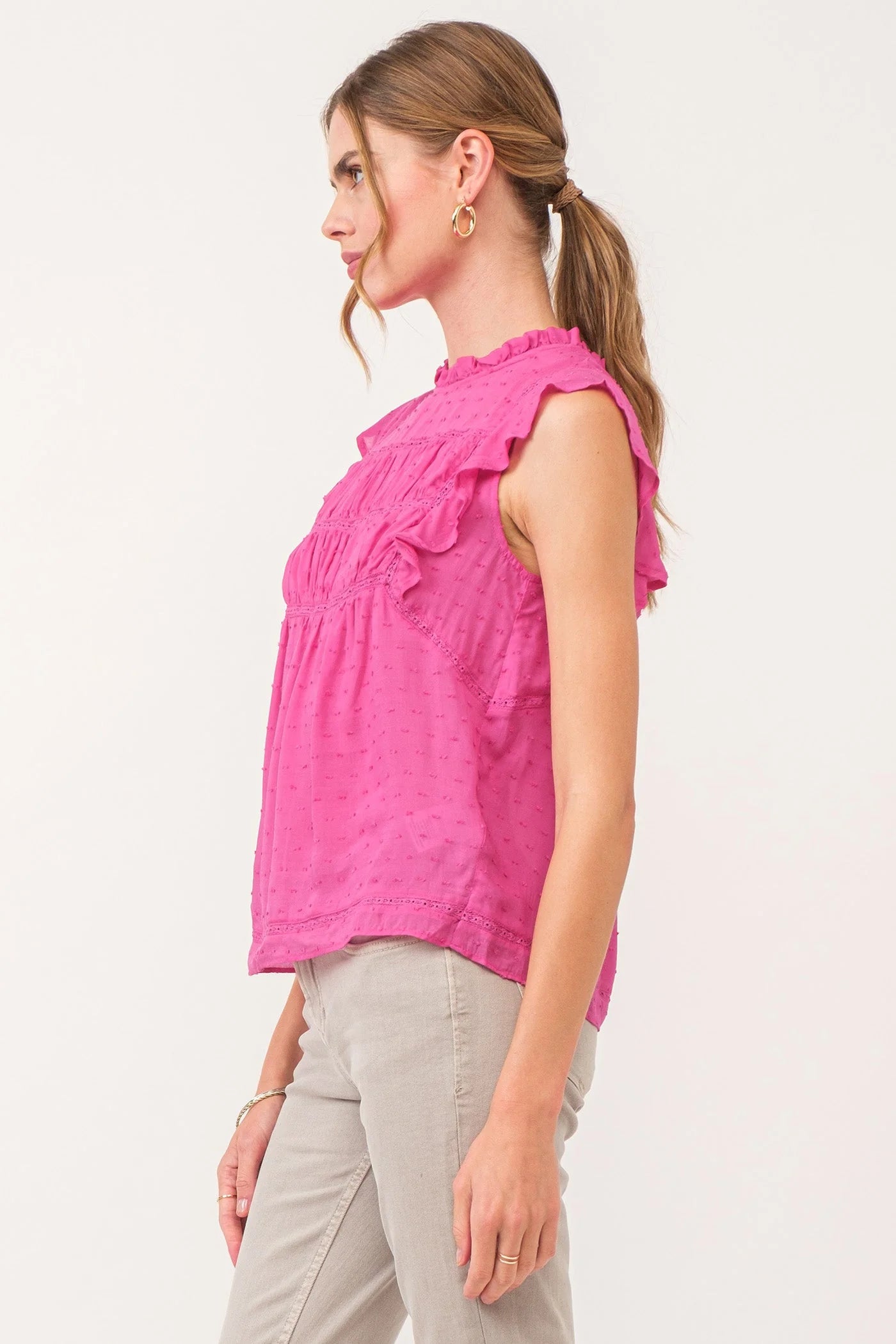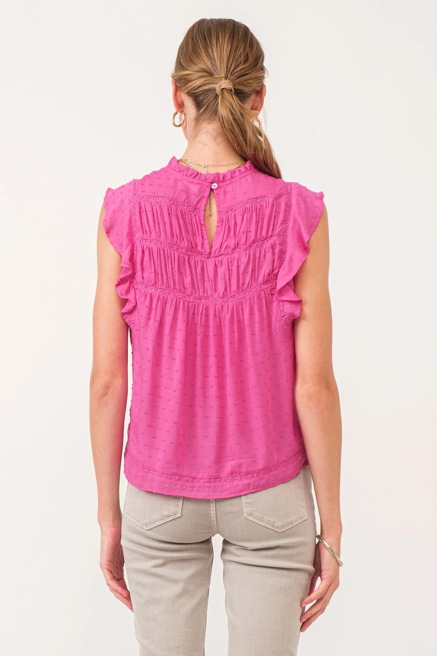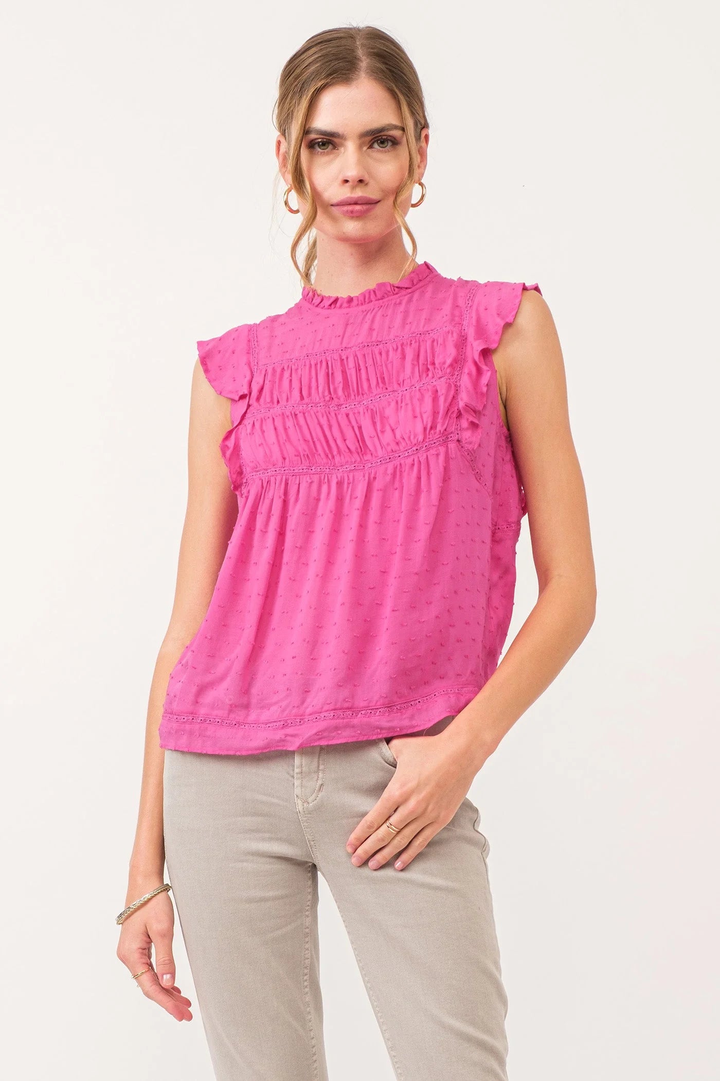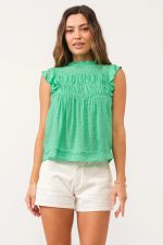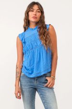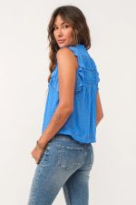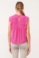 Back keyhole top, ruffle crew neck accessorized with lace trims at neck & yoke panel finished sleeveless with petal armhole in pointelle woven. Solid color woven on relaxed fit. Inspiring feminity in timeless design, embracing the spotlight the epitome of trendiness…