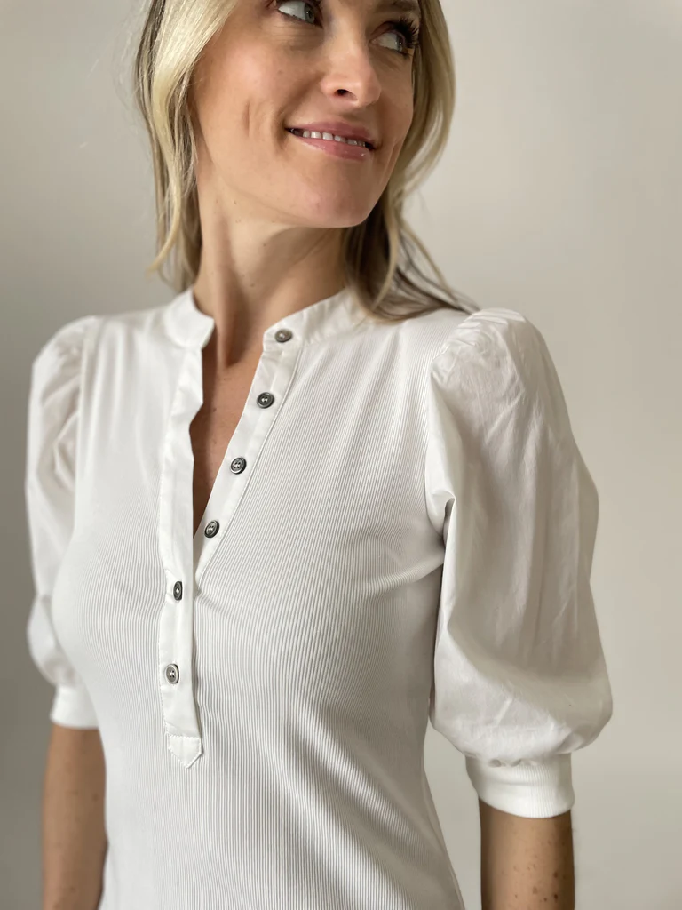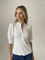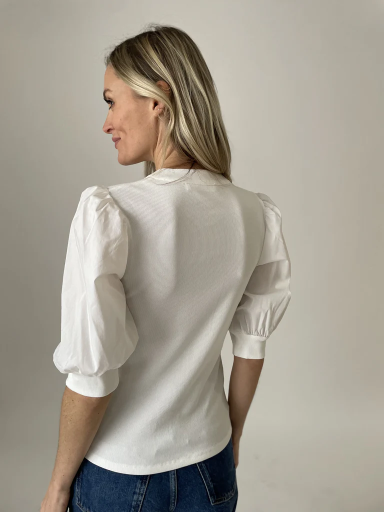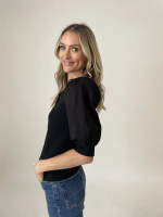 Audrey is the perfect mix of casual and chic. The bodice of this top is ribbed, and the sleeves and trimming are shirted. Make your look sophisticated by wearing this top with a satin skirt and heels, or pair it with jeans and a sneaker.