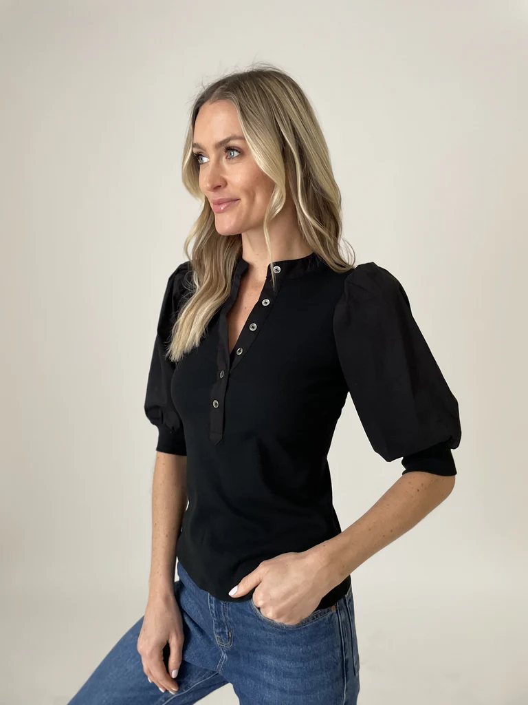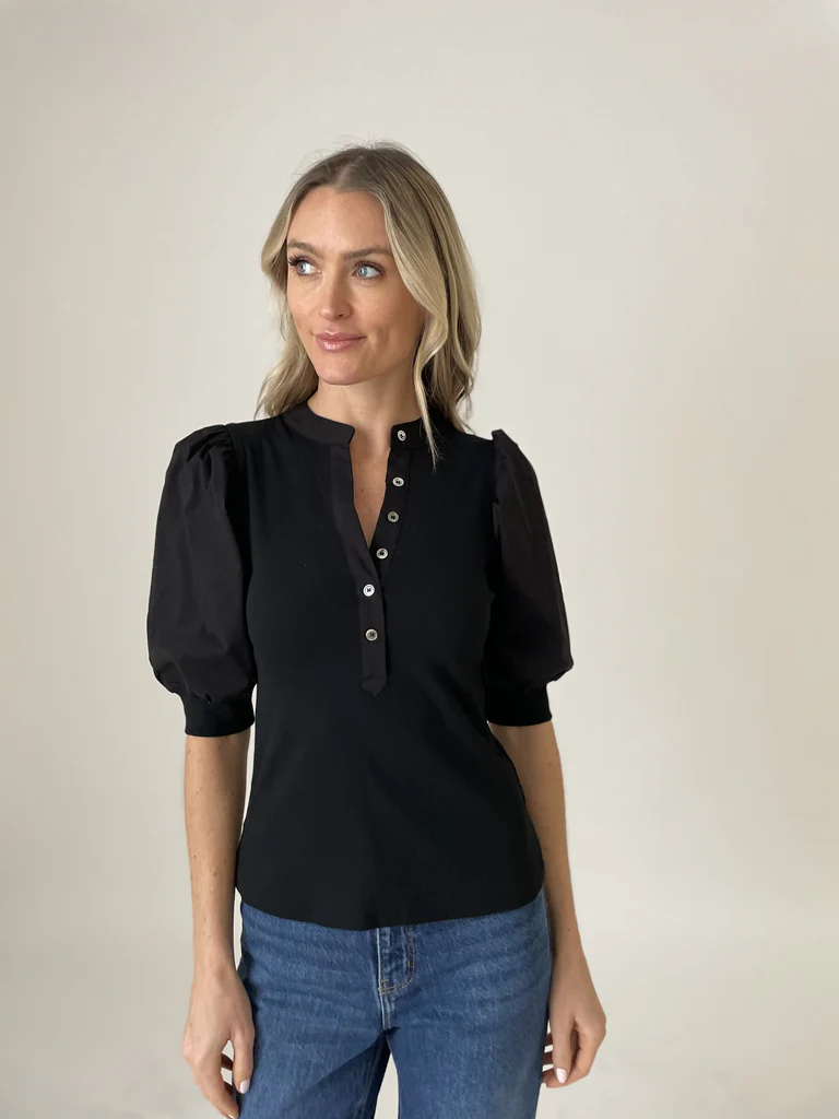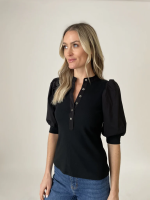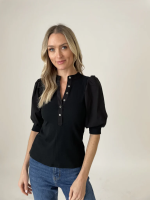 SKU: N/A Category: TOPS Tags: All Tops, Audrey Mixed Media Top, Button Front, button up, Button Up Top, crepe hacci fabric, flowy silhouette, ribbed body, short sleeve top, Tops