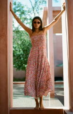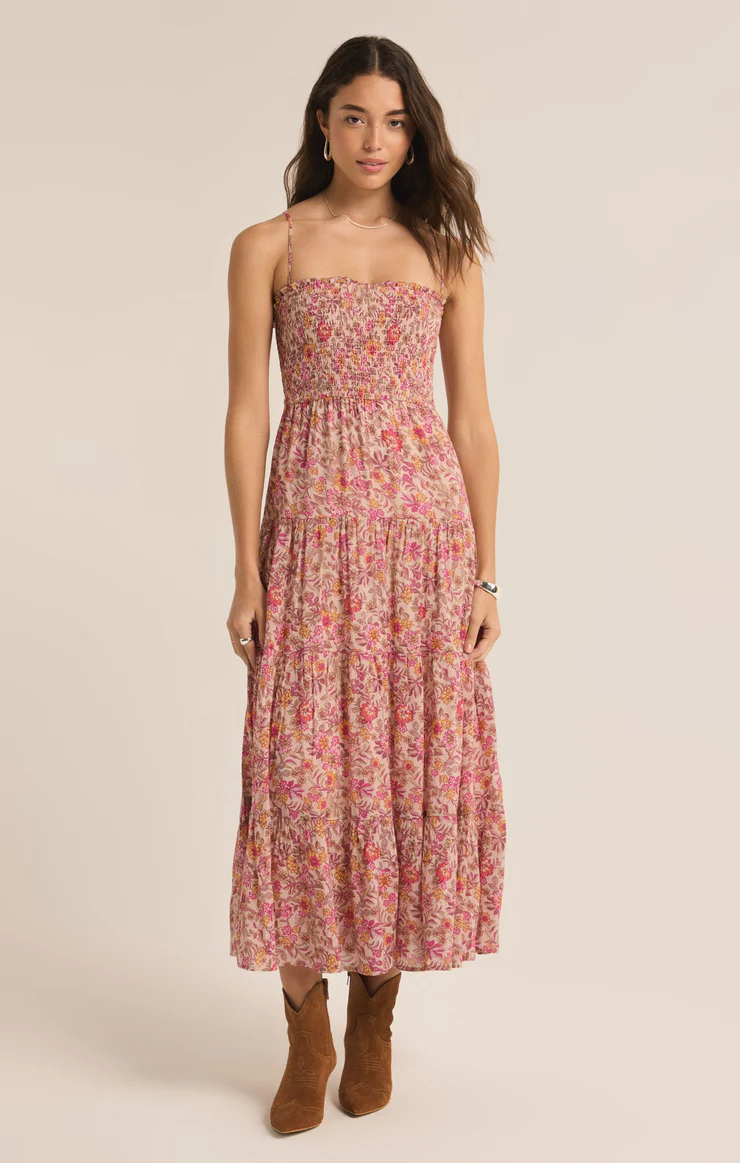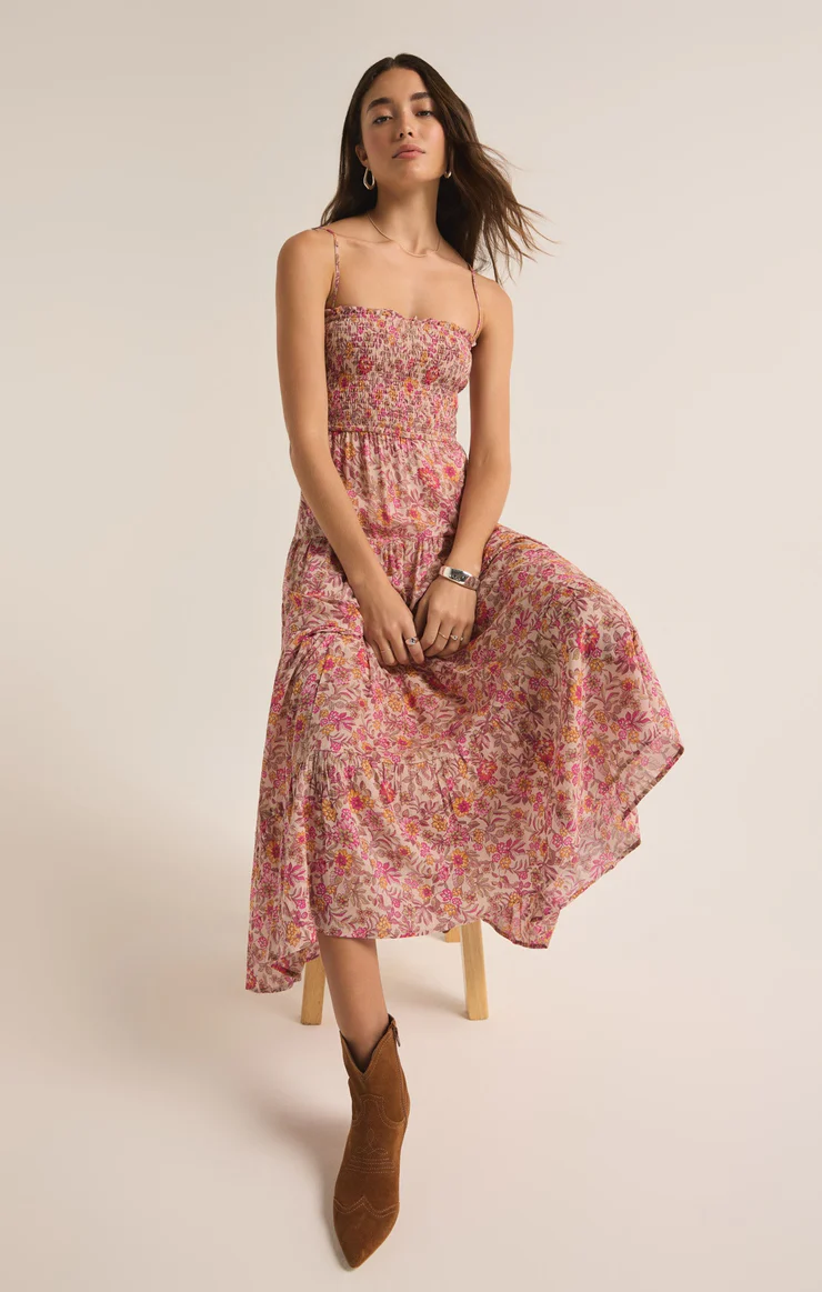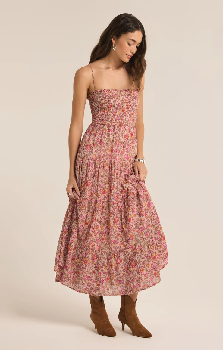 This breezy floral maxi dress will have you flowing through your day in satiny textured voile. We can’t decided which flattering details we love best; the square neckline, smocked bodice, or the flowy, tiered skirt.