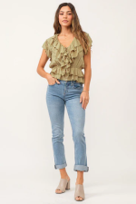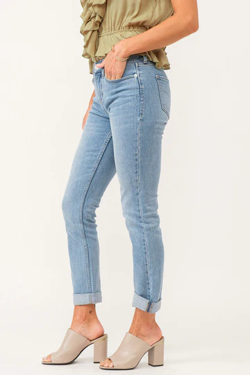 Mid rise cuffed slim straight leg jeans. The standout fit that comfortably rests slightly lower on the waist, shaping up effortlessly from the hip to mid thigh. Cuffed inseam on stretch denim accented with hand sanding hip & back knee whiskers, inseam chevrons, pocket & hem grinding.