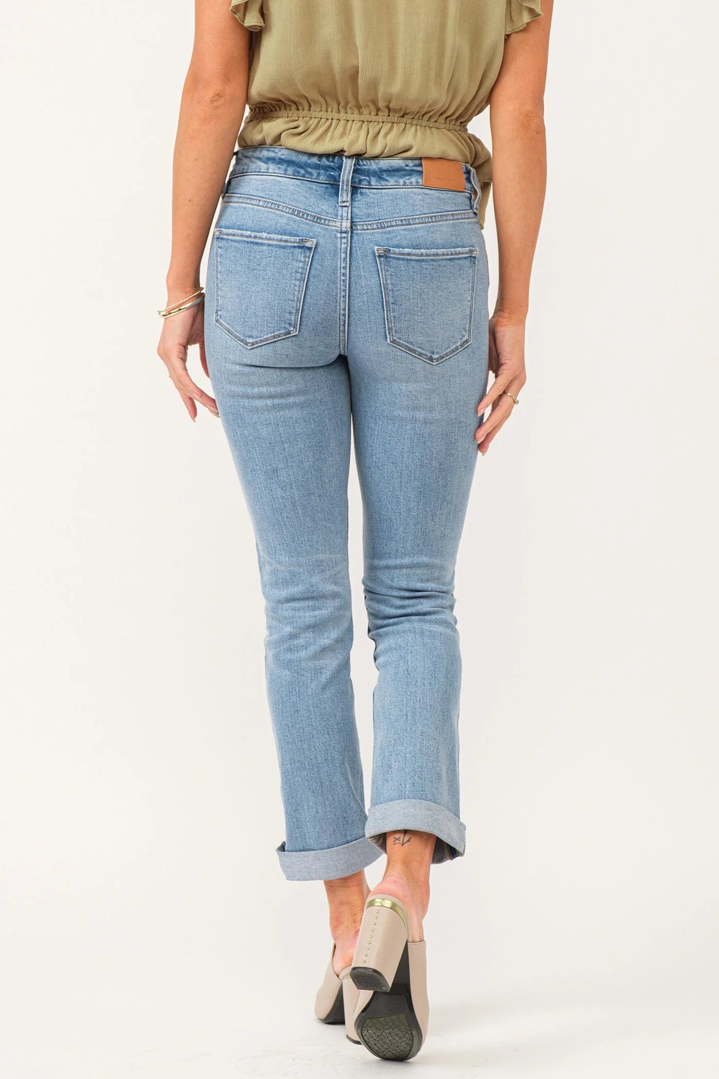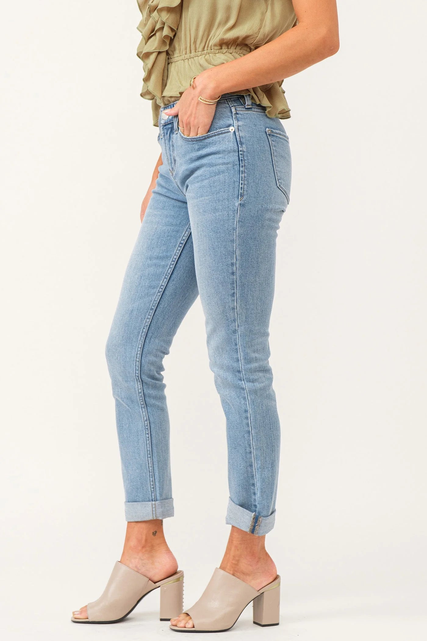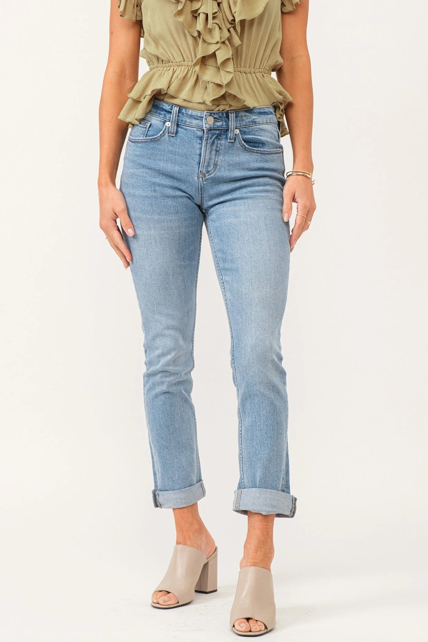 Mid rise cuffed slim straight leg jeans. The standout fit that comfortably rests slightly lower on the waist, shaping up effortlessly from the hip to mid thigh. Cuffed inseam on stretch denim accented with hand sanding hip & back knee whiskers, inseam chevrons, pocket & hem grinding.