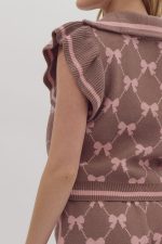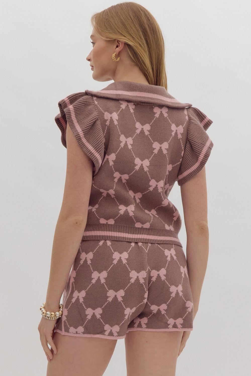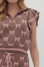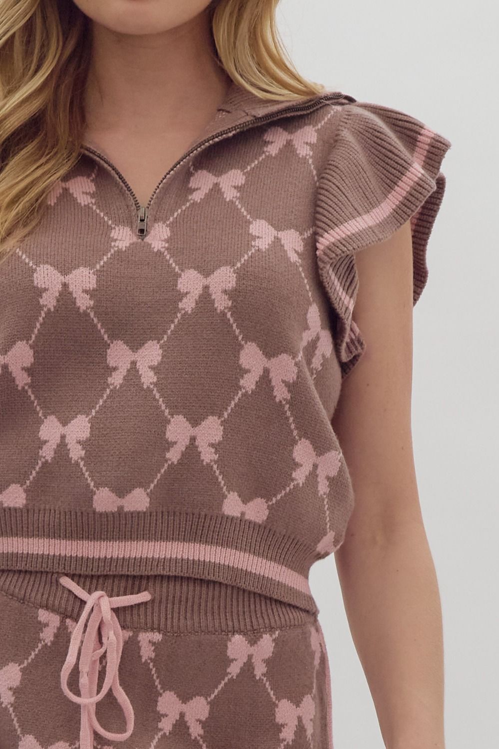Bow print flutter sleeve crop sweater top featuring half zip detail.