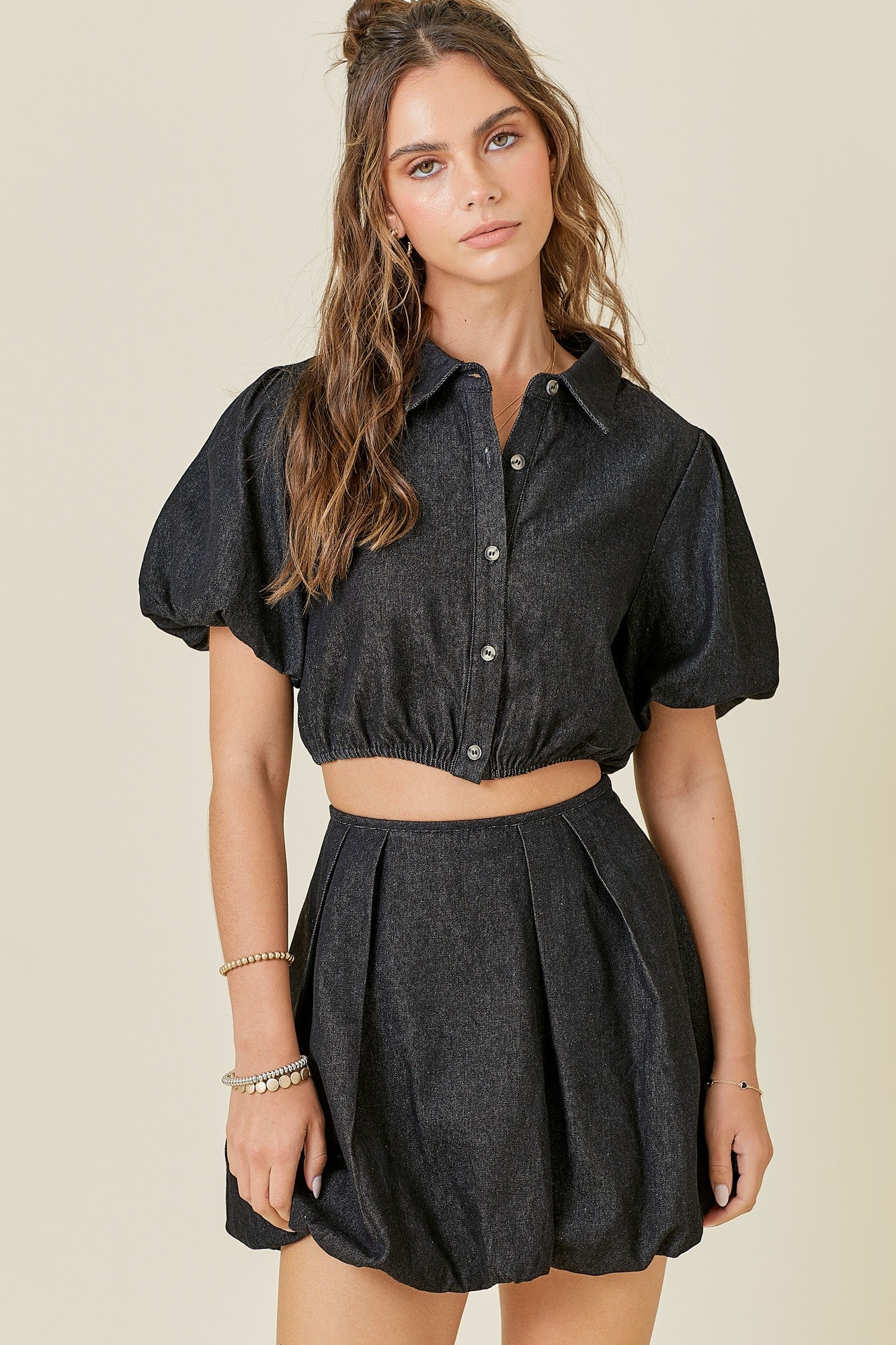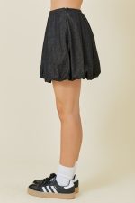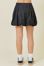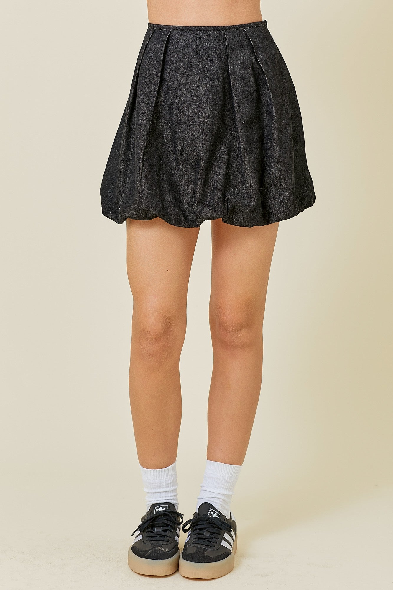 Denim Mini Bubble Hem Skirt with Pleats Detail