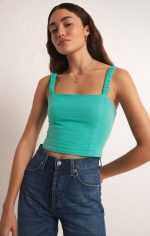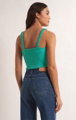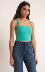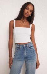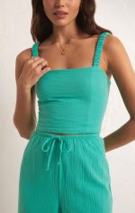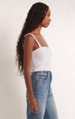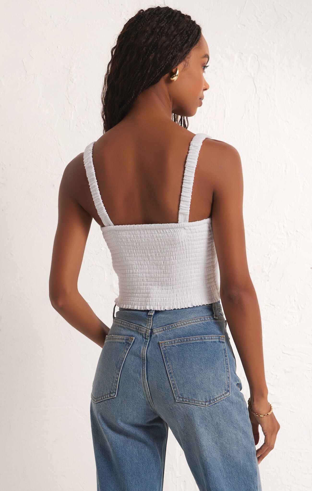 Cropped with a flattering straight neckline, this fitted top features elastic straps, a fully smocked back and sits at the waistband. Our double gauze fabric is so comfortable and gives this top a resort feel.