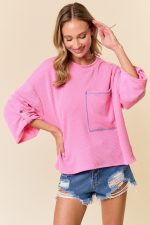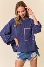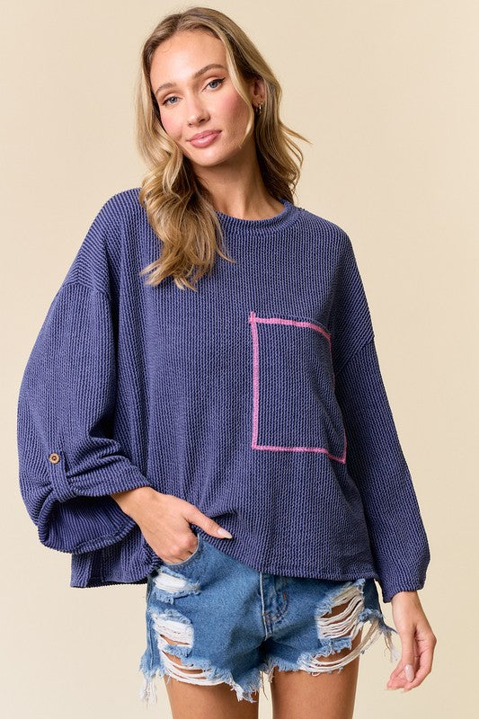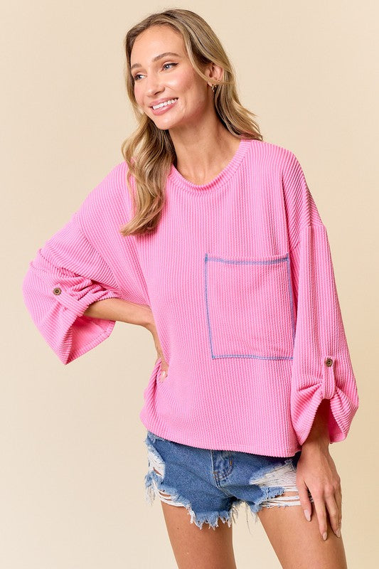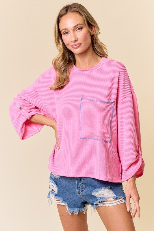 This light weight top is made of rib material. Features a solid color with a front pocket and a adjustable sleeve with button.