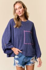 Striped color block long sleeve sweater top featuring a ribbed round neck, added seams throughout, ribbed cuffs, two side slits