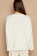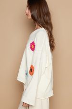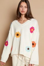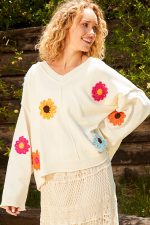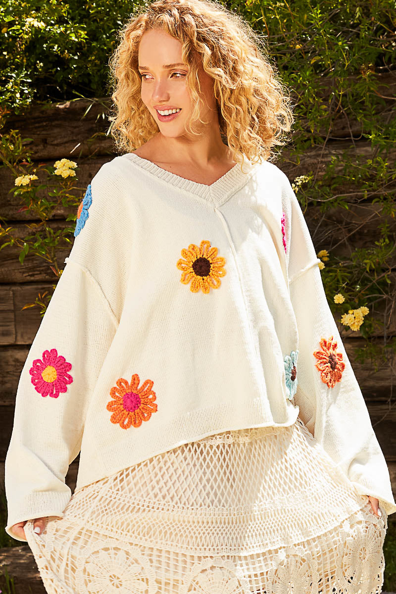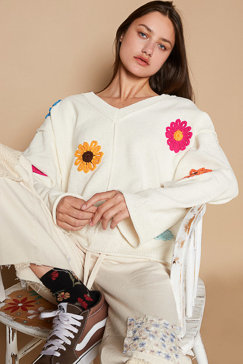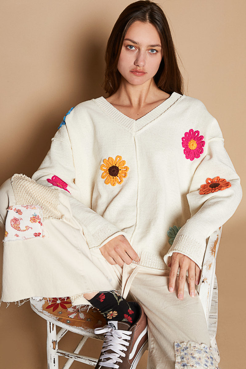 Designed in V-neck long sleeve relaxed fit sweater in chenille with flower patches.