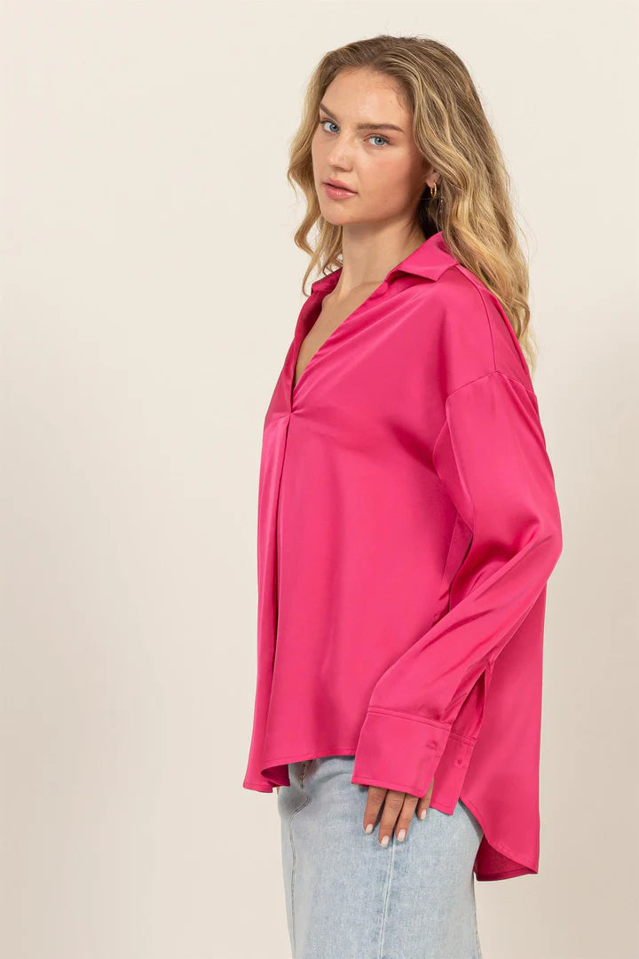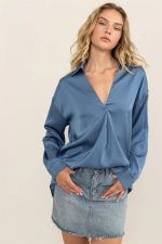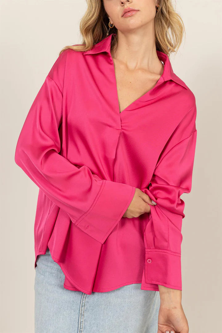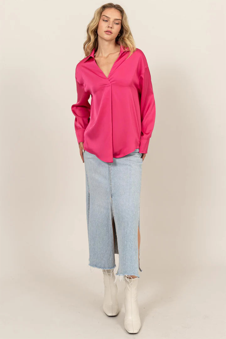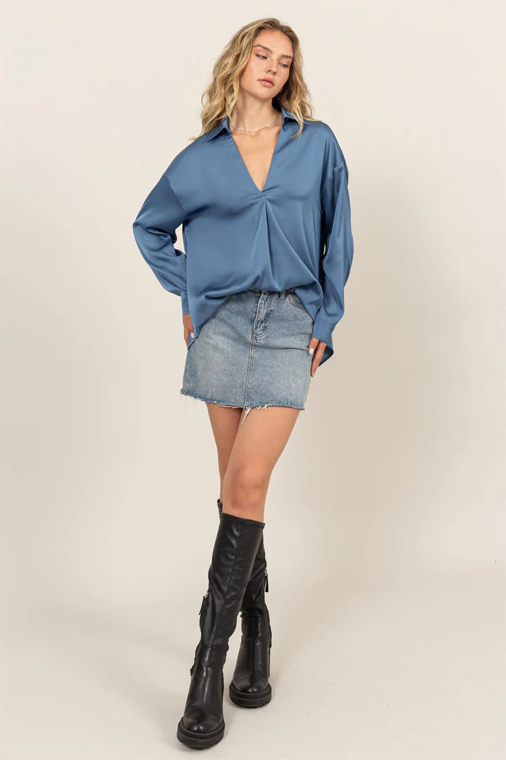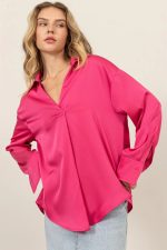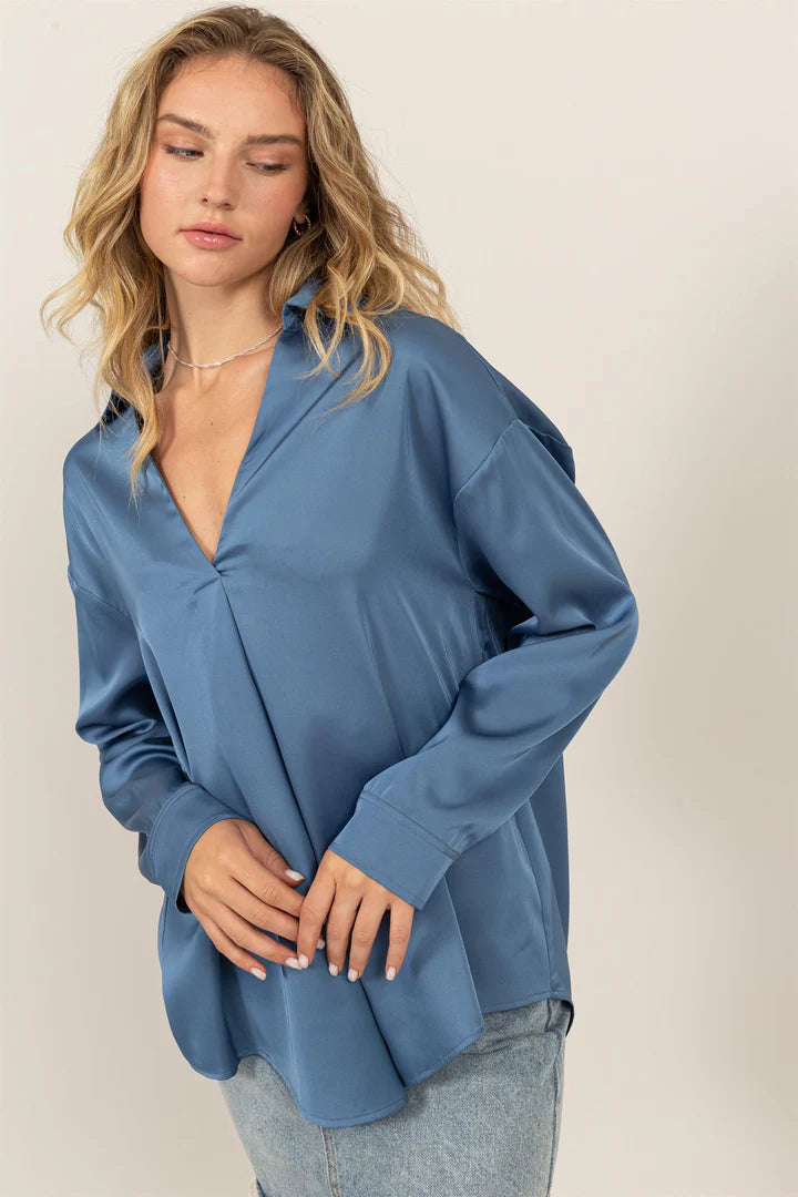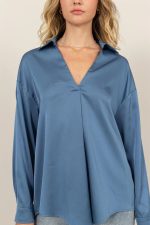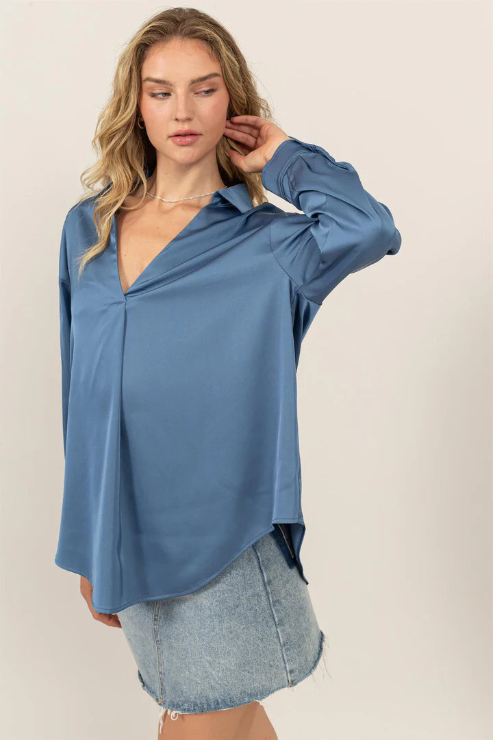 Tags: All Tops, collard top, collared, collared neckline, collared top, deep v-neckline, long sleeves, long sleeves top, relaxed fit, relaxed fit top, satin, satin top, top, Tops, v-neck, v-neck collared, v-neck satin blouse, v-neck top, v-neckline