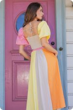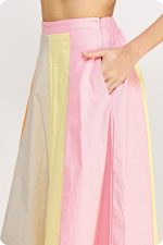This A-line style features paneled color block construction, side pockets for comfort, an elasticated waist at the back, hidden side zipper closure, and lining.