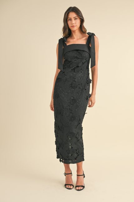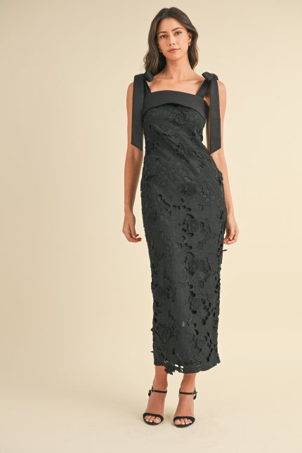 Shoulder strap tie detail all lace floral fitted midi dress with back middle slit detail. Lining. Fabric Contents: SELF: 100%