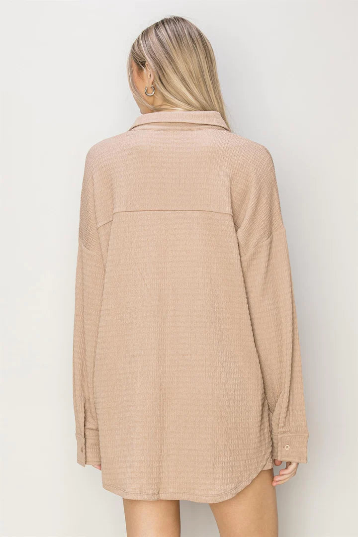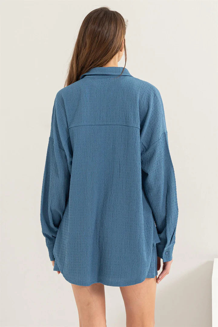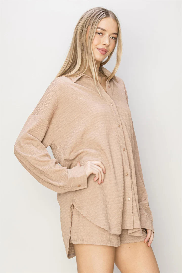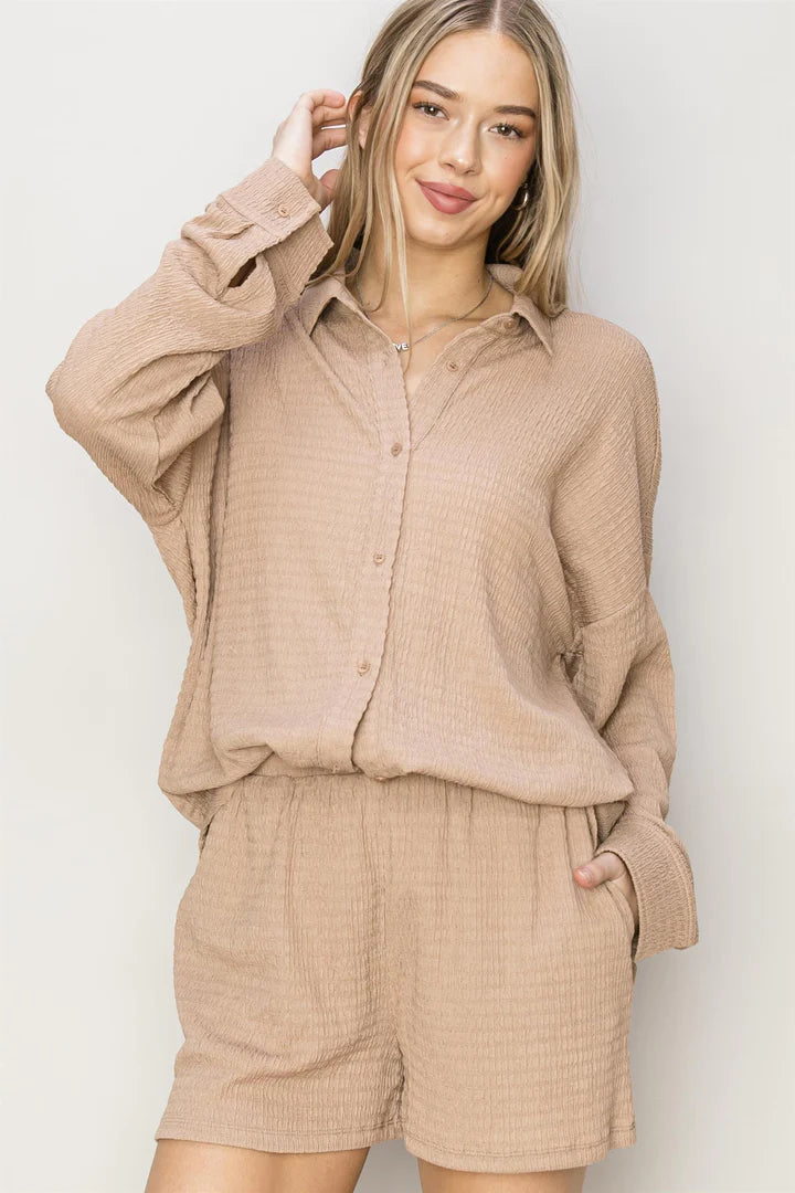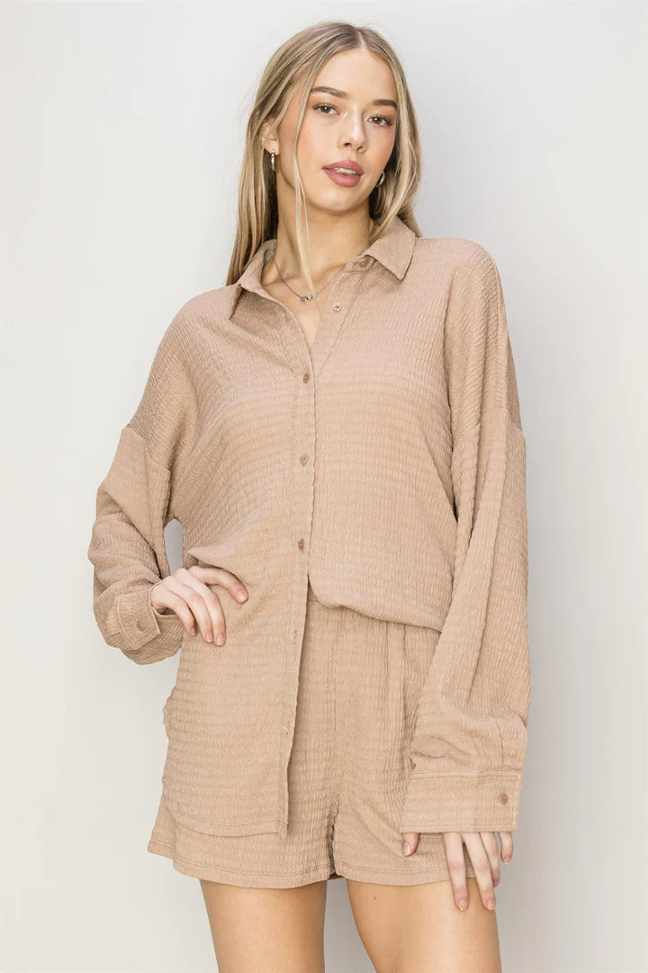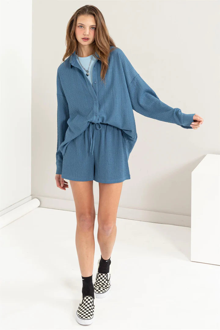 You are sure to stand out in this crinkle knit two piece set. The oversized shirt boasts a collar, drop shoulder, long sleeves, and a button front closure, while the matching high waisted shorts are tailored with a drawstring fastening and a side pocket.