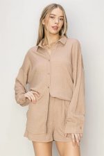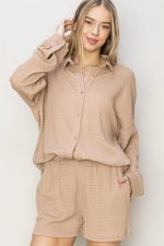 Tags: All Tops, Bottoms, button front closure top, comfy short set, drop shoulder, Drop Shoulder Top, drop shoulders, High waisted shorts, long sleeves, long sleeves top, oversized top, short set, top, Tops